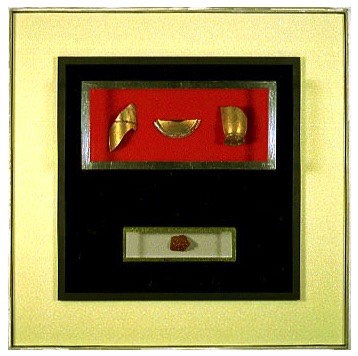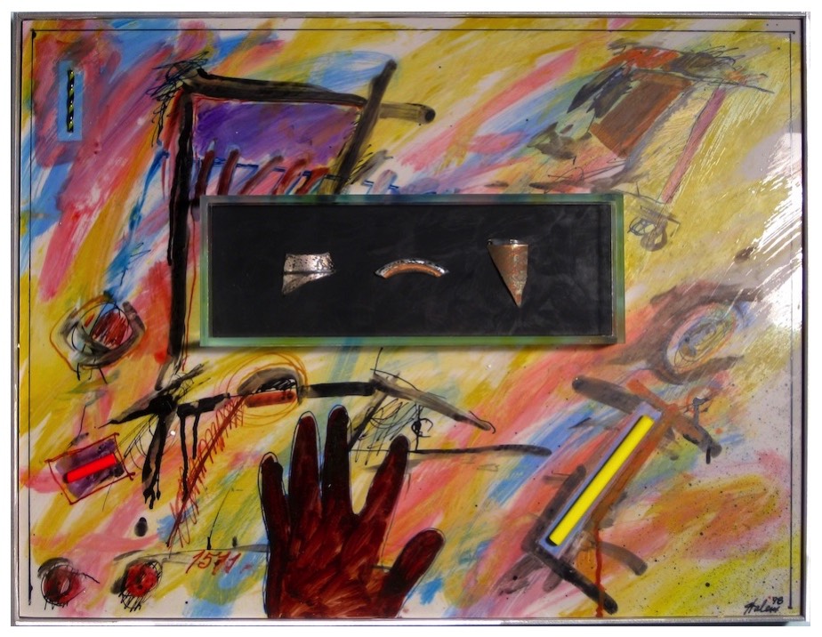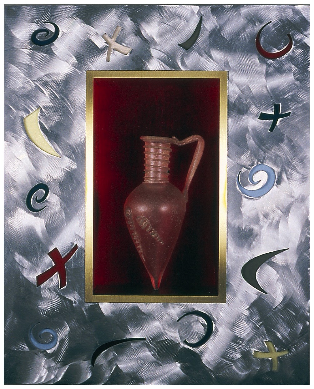 Egyptian Shield: Glass enamel on Vitrolite, Aluminum framing. $1,000. 11 x 17