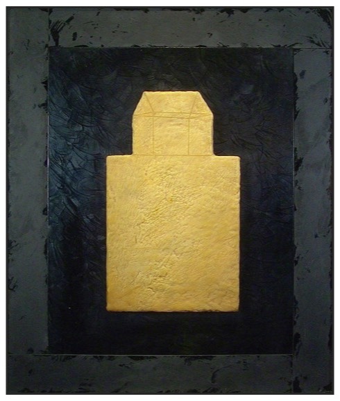 Golden House: Yellow float glass, gold leaf. $1,250. 24 x 23