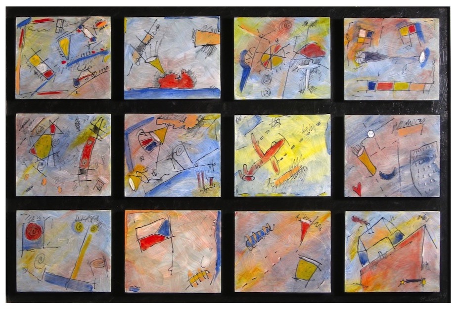 12 Pieces: Fired glass enamels on glass. $2,000. 32 x 31